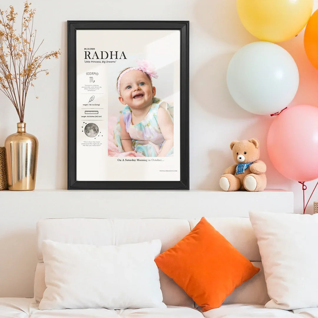 The Baby’s First Moments Frame is created to preserve all of that magic. It lovingly brings together your baby’s name, birth details, zodiac sign, and a joyful photo — turning those fleeting moments into a keepsake you can hold close forever.